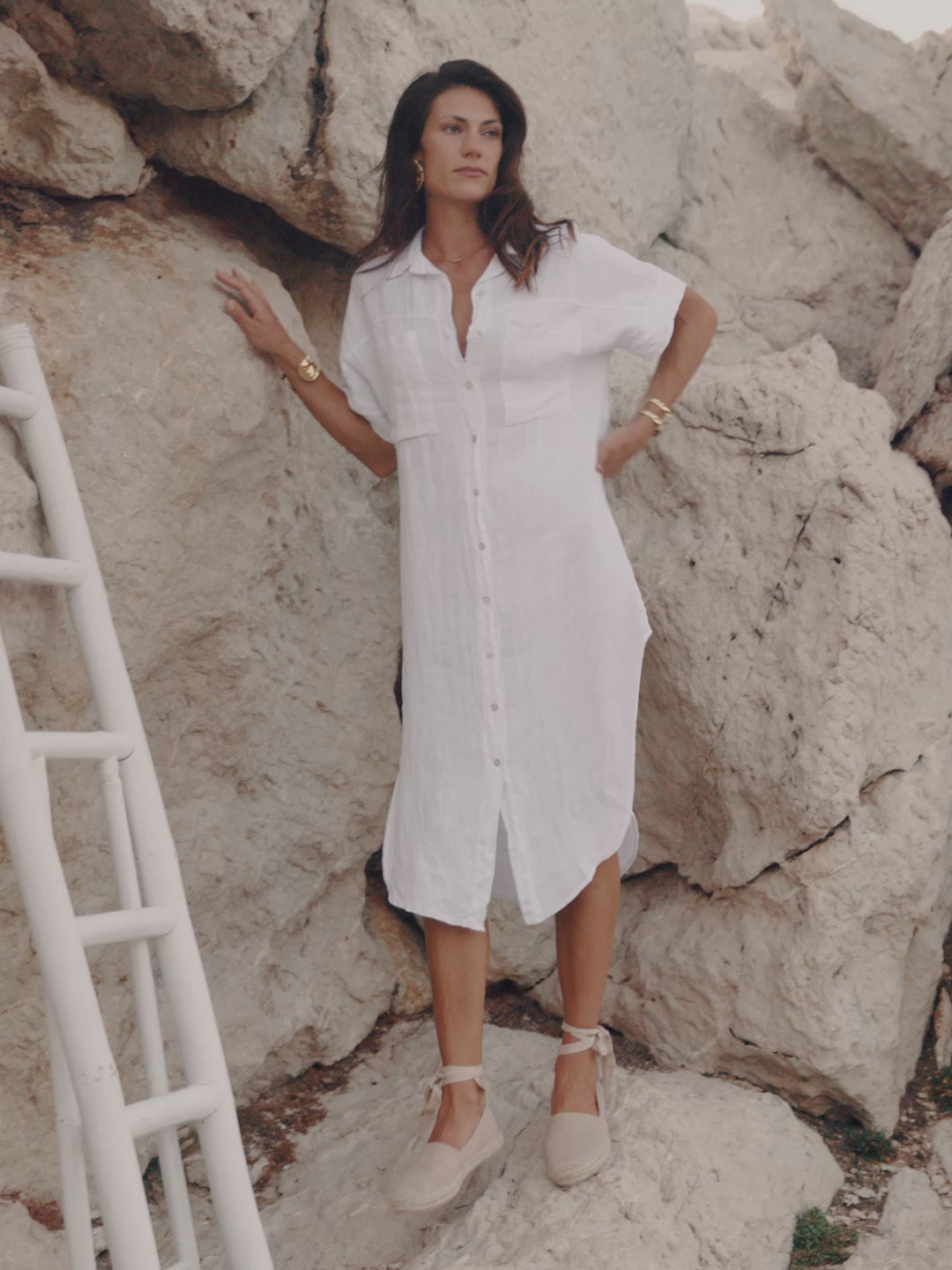 This linen shirt dress features short sleeves, front pockets, and a button-down design that offers structure with freedom. Its straight cut and side slits make it easy to wear loose or belted, from morning walks to late afternoons.