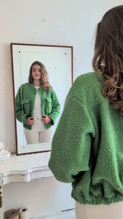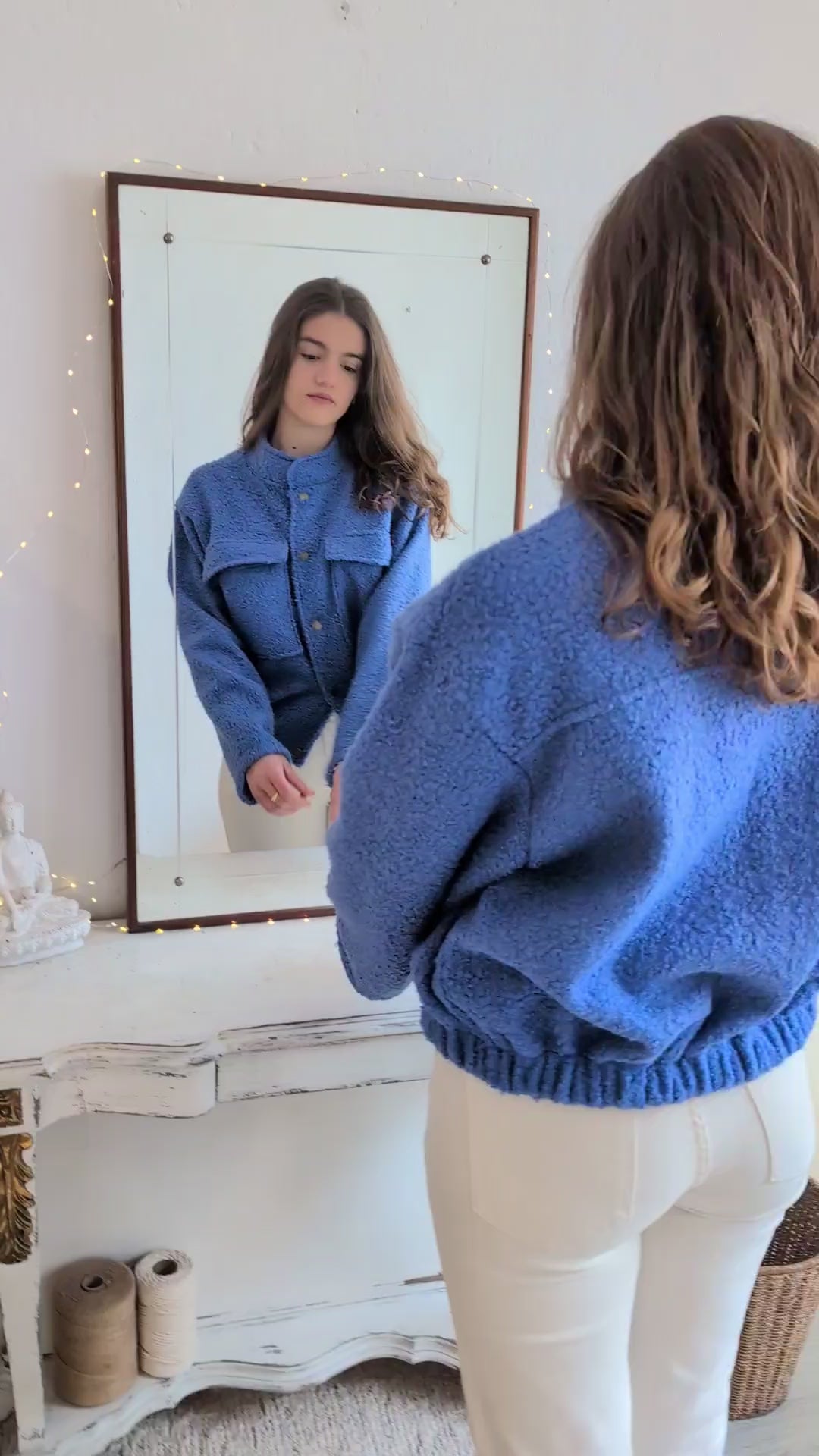Soft to the touch and lightweight in structure, this bouclé bomber jacket is designed to bring warmth, texture, and effortless style to your everyday looks. Featuring a modern round neckline, metallic front button closure, and utility-inspired front pockets, it blends elegance with a cool, contemporary edge.